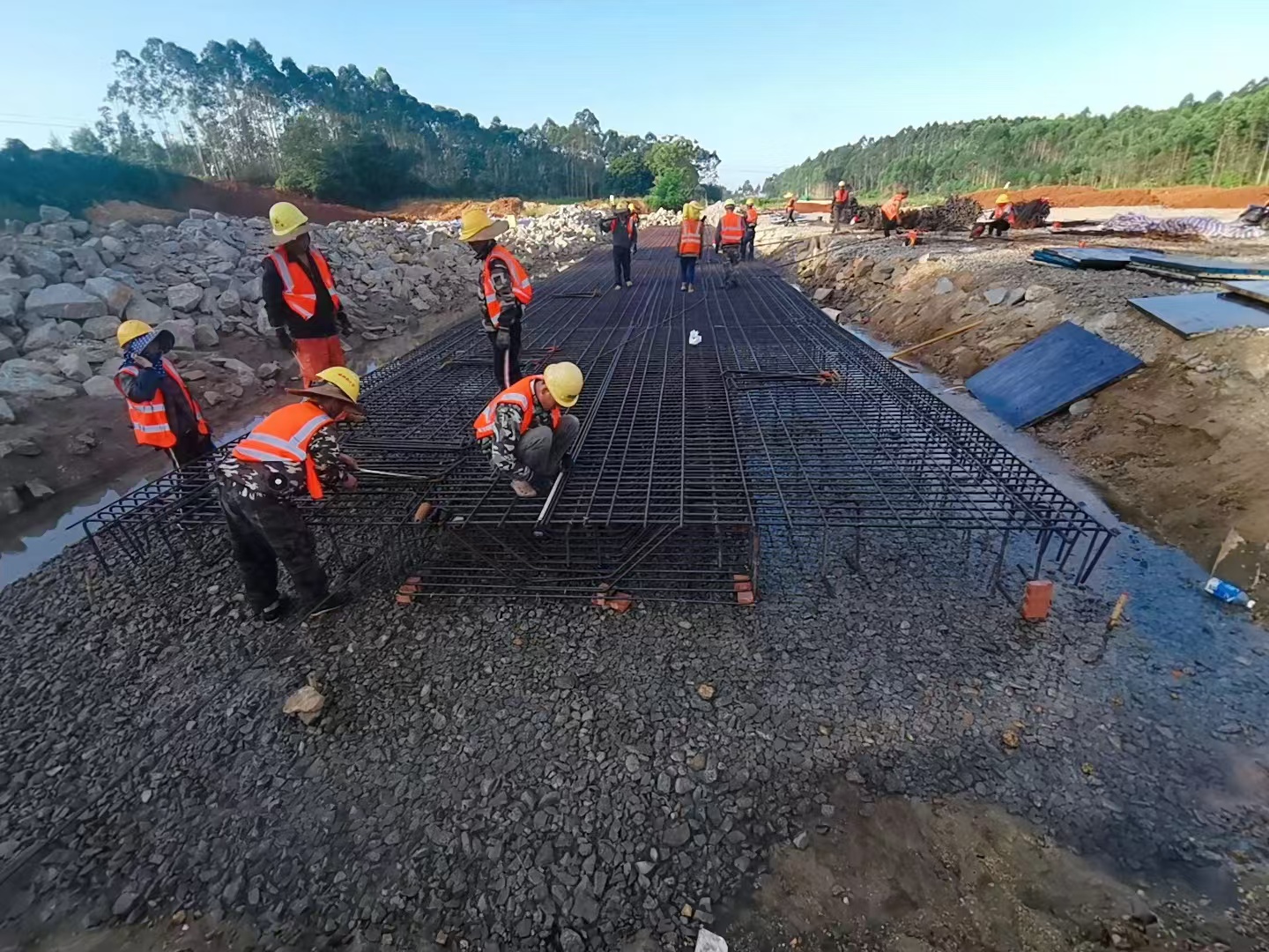 (图片为工人绑扎涵洞钢筋施工)