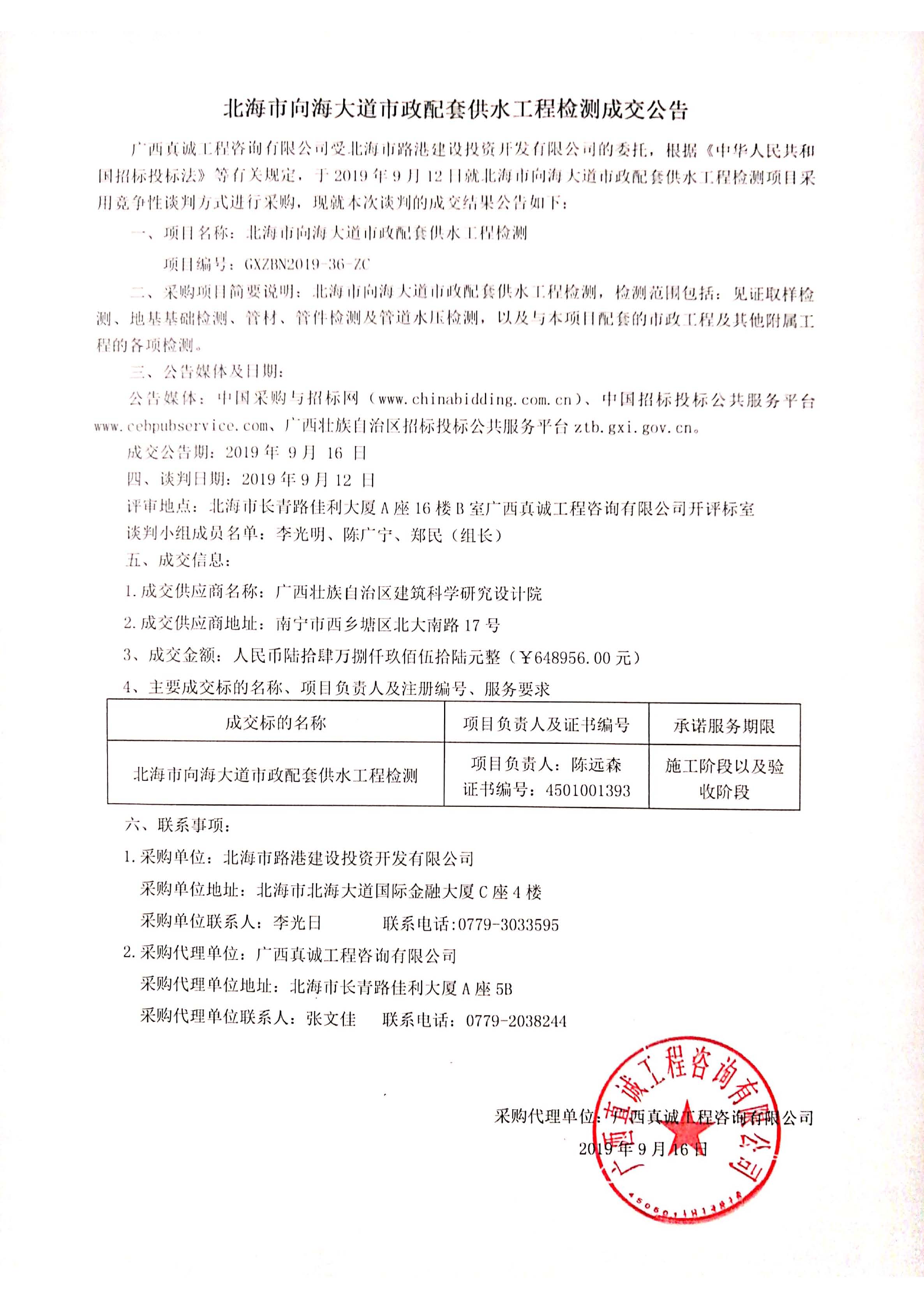 北海市向海大道市政配套供水工程检测成交公告