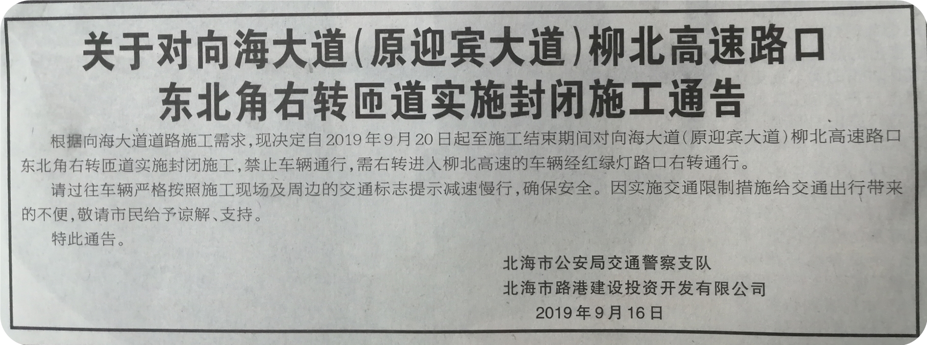 根据向海大道道路施工需求,现决定自2019年9月20日起至施工结束期间对向海大道(原迎宾大道)柳北高速路口东北角右转匝道实施封闭施工,禁止车辆通行,需右转进入柳北高速的车辆经红绿灯路口右转通行。